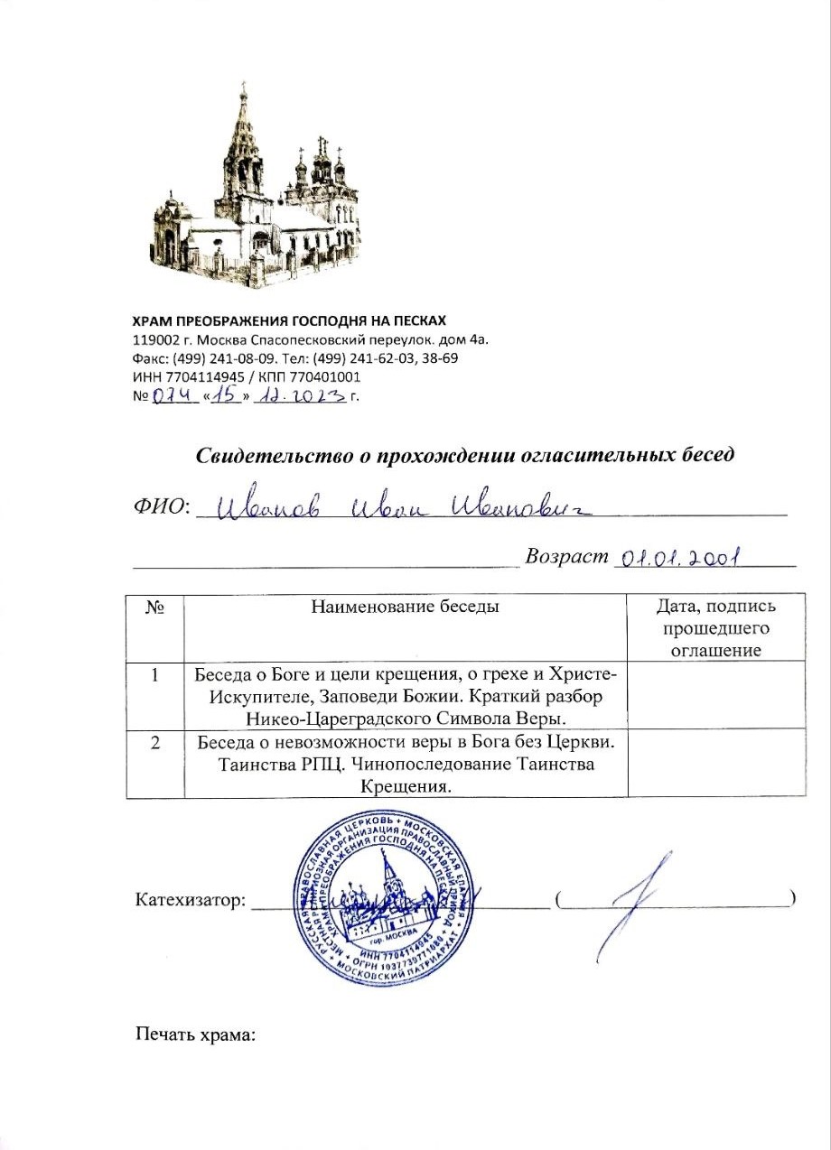 В каждом храме проводят такие огласительные беседы. Сначала священник рассказывает о православном вероучении и таинствах, потом проводит собеседование — что-то вроде экзамена, с вопросами и ответами, доказывающими понимание сути обряда, а не только его внешней стороны. И если все будет хорошо, то после этого он выдаст справку о прохождении собеседования перед крещением. Но если священник посчитает, что человек еще не готов, церемонию отложат.