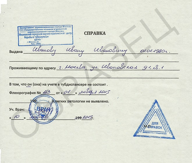 Получить такой документ в частной клинике нельзя, потому что в таких учреждениях обычно нет соответствующей лицензии и не работает фтизиатр. А в тубдиспансер многие не хотят идти, потому что даже при соблюдении всех требований гигиены есть риск подхватить палочку Коха — возбудителя этого опасного заболевания. Но можно купить справку из тубдиспансера в Москве в нашем центре. Стоимость услуги — 1500 рублей. Вы получите настоящий документ, оформленный по всем правилам. И для этого вам не придется лично ехать в тубдиспансер, что не только экономит время, но и минимизирует риск инфицирования.